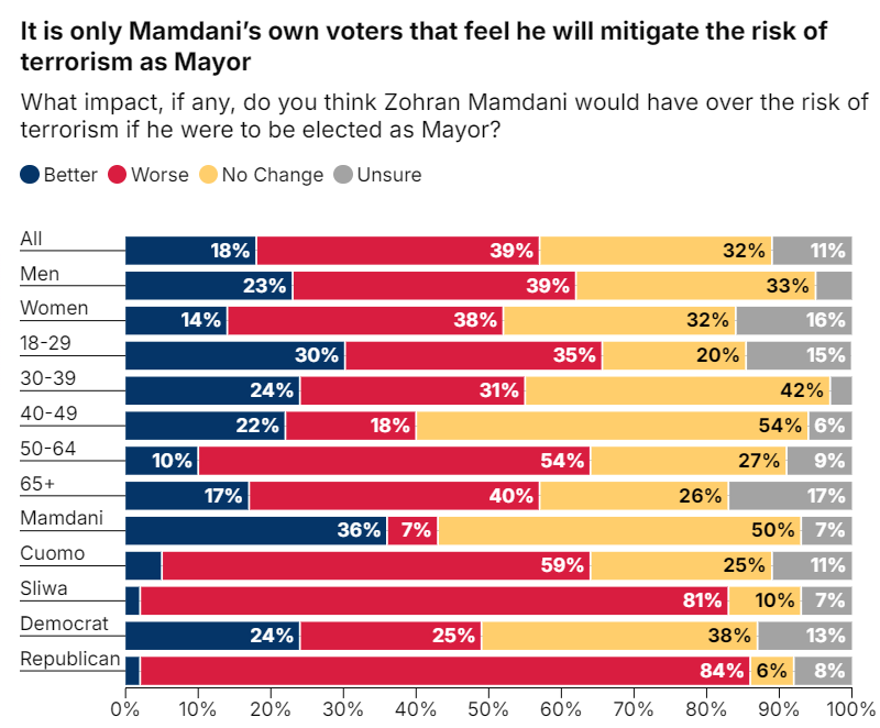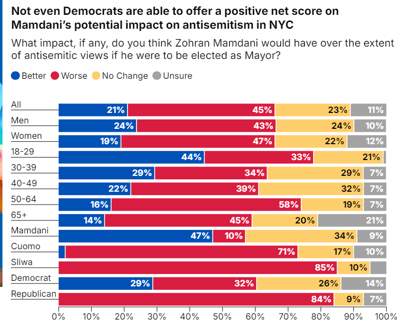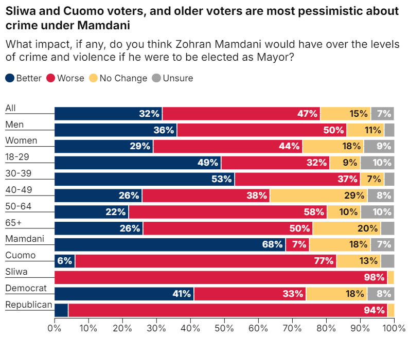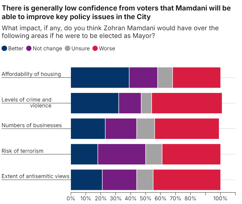对于反对曼达尼的人来说,犯罪率上升是他们最大的恐惧之一。超过四成受访者认为,如果他上任,城市的治安和暴力犯罪都会恶化,几乎一半人担心反犹太主义事件增加。只有在“住房可负担性”这一项上,更多人相信他的政策会带来改善。
